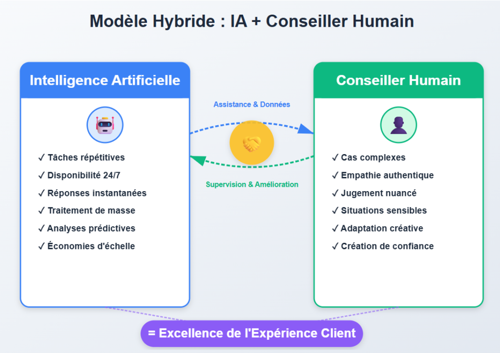 La question n’est plus “IA ou conseillers humains ?” mais “comment optimiser leur complémentarité ?”. L’IA excelle dans l’automatisation, la rapidité et le traitement de données massives. L’humain apporte empathie, jugement, créativité et capacité d’adaptation aux situations complexes.